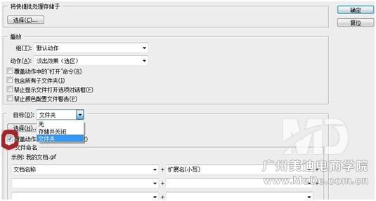 之后再操作在下方的目标,从“目标”那里选择“文件夹”,还是之前建立的那个“临时水印文件夹”。同时把“覆盖动作中的储存命令”勾上,点击“确定”。