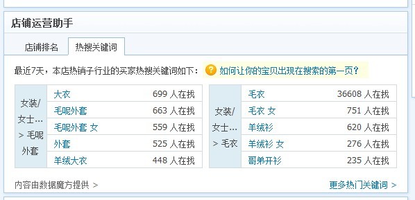 运营助手,可以看到关键词,因为我这个店以前放的是毛衣 所以显示了毛衣的关键词。