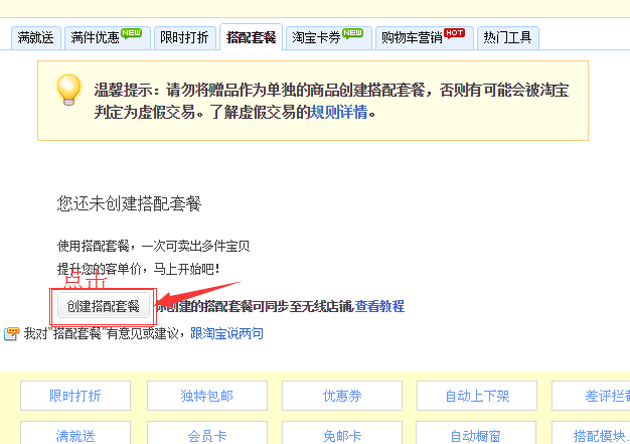 13.进入套餐搭配,系统会提示我们还没“创建搭配套餐”,我们点击“创建套餐搭配”.